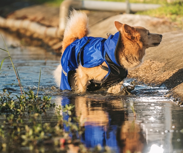 前套式設計,讓毛小孩只需扣上腹部插扣,就能迅速出門。頂級防風、防水布料,同時具有包覆、防水與穿脫便利的多重優點。
